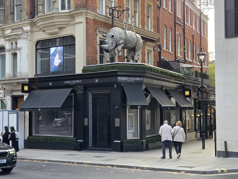 After surveying the area, you can see why Princess Diana liked this area, for its ambience of retreat & solitude. Princess Diana was my favourite royal & now I admire Princess Kate (Catherine). I left the grounds of Hyde Park & walked along the ultra-long street of Kensington Rd, joining onto Knightsbridge & I felt another nosebleed from the air of money to live in these buildings. Plenty of embassy’s too & very expensive cars. Located at 161 Knightsbridge I came across something quite extraordinary to be found in London … a suspended rhinoceros above Samer Halimeh NY, a 2-storey famous US jeweller shop with 30mm bulletproof glass windows & prices start at £5,000. This renovation cost £10mil based on bringing NY architecture to London. With the ‘nosebleed’ & constant viewing of architecture & the like I ultimately took a wrong turn & headed down Vauxhall Bridge Rd but realised in time before I got to the River Thames. The more you look around London, the more you see.