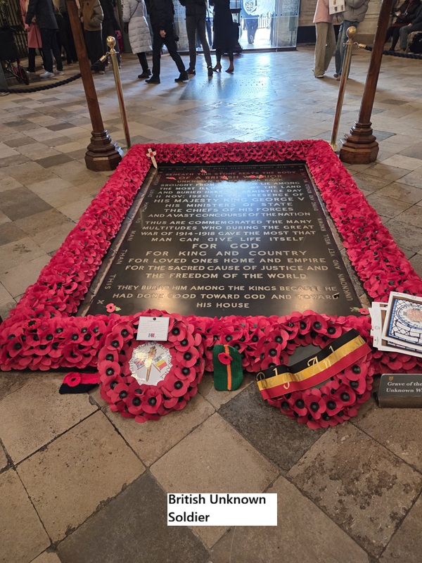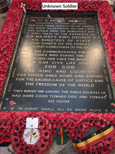 The ancient Coronation Chair (1301) is still present in the Abbey for viewing but you need good eyesight for the distance from the barricade & is used to this day but has been decorated over the centuries. The happiest event of late was the marriage of Prince William & Catherine, 29th April 2011. At the West Door entrance, the first tomb inlaid in the floor is The Unknown Soldier from WW1 surrounded these past days with the recognised poppies & wreaths are laid in every war service. Upon leaving, I bought a booklet for £9.00 for future reference & hasn’t that been a godsend of good fortune.