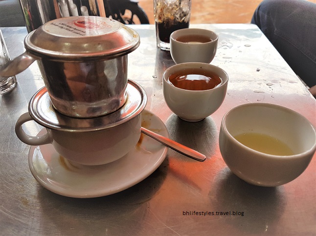 Another shopping centre came into view further up the road with more elephant walking rides for tourists and it was timely for Chung to schedule into a morning Vietnam coffee. I was starting to be addicted to this coffee and for that time of the day too. Good move Chung. With coffee over, we scooted out to see acres & acres of rice paddies in a real commercial venture with plenty of workers attending to it. Next came a herd of cows being taken to another pasture by the farmer & this can be done daily. Chung, taking no chances with the cows stopped by on the roadside however these cows showed every sign of ignoring our presence. This is the first time I had seen this cattle droving in Vietnam. In Australia it used be done & was called droving in the ‘Long Paddock’.