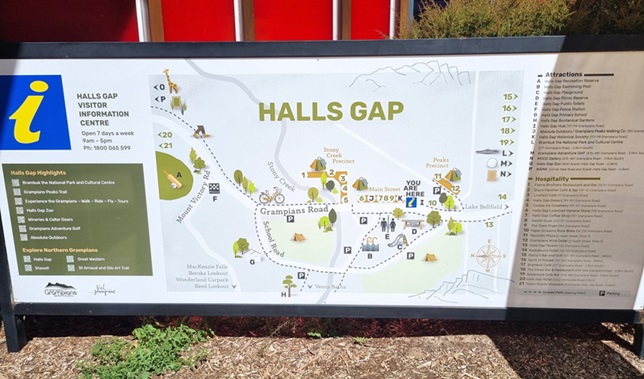 Driving through Halls Gap from the north & then slightly out of the township we came to our night lodgings, The Lakeside Caravan Park with the entry point of a boom gate. We had booked online so we had our specific entry code however, we had a car in front trying to gain entry but seemed to have much difficulty in doing so. The couple appeared to be about my age or a little older going through all the signs of emotional frustration. EGR, quite determined to gain entry to shut down for the day, plus she is an ever caring & helpful person, so within a flash she was in conversation with them before I could blink.