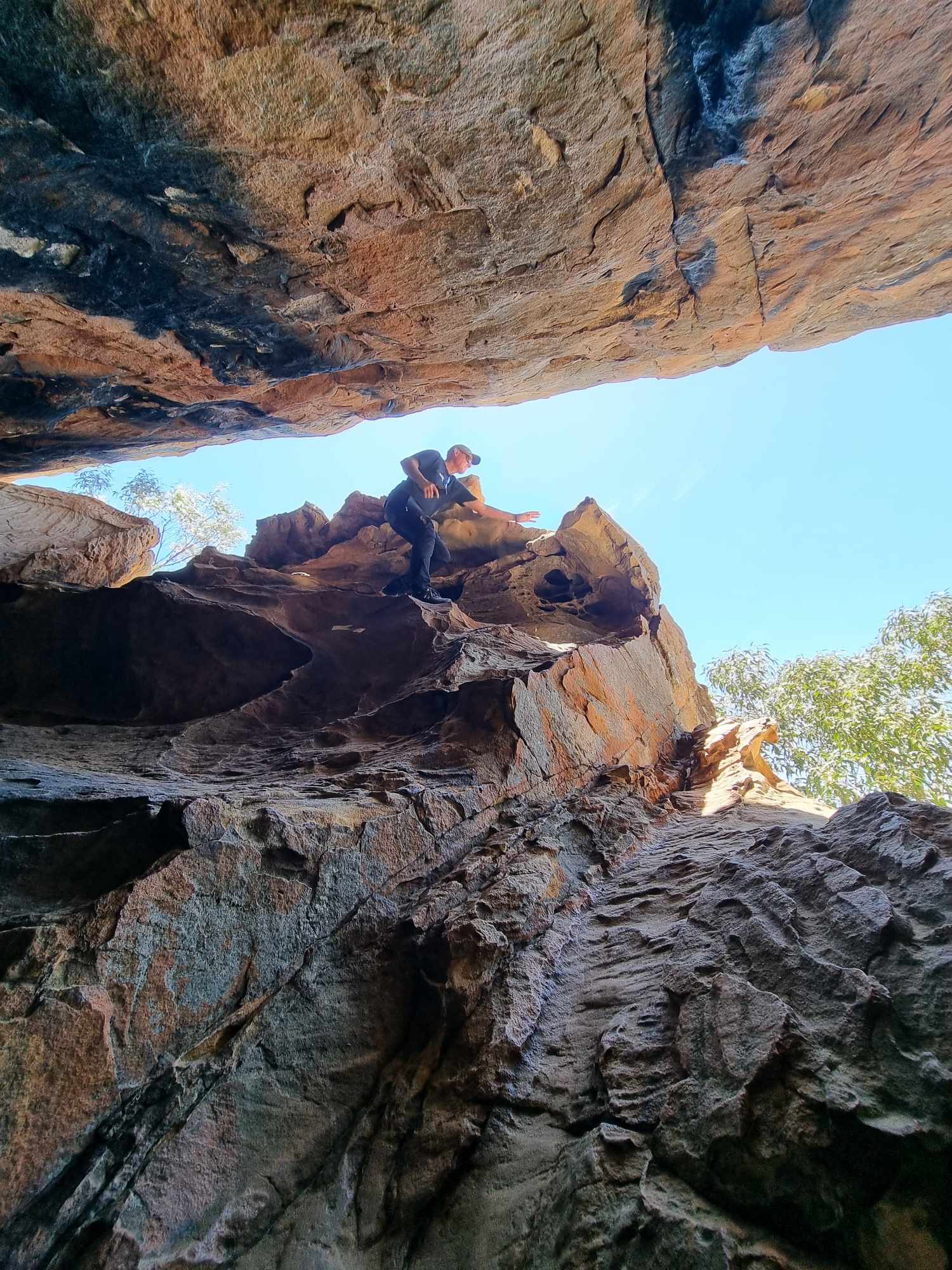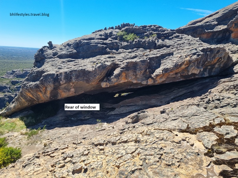 You wouldn’t guess it … for another 50m of edging over that boulder outcrop it became a flat surface where I found myself standing in front of the ‘window’. What a relief & a prized result. I quickly returned to EGR who was now determined & excited to see this ‘window’ & soldiered on. Being at the front of the window I was assessing the best way for both of us to enter the narrow openings at both ends of the window when EGR spoke to me through the window, for she had walked around the ‘corner’ & entered through the much larger opening at the back of the cave. OK!! EGR won the smart trophy.